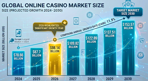 According to a report published by Grand View Research, the online casino market size in 2024 was $78.66 billion and is expected to reach $98.14 billion in 2026. With a CAGR of 11.9%, the total market size can reach $153.57 billion by 2030. Europe was the largest market in the online casino industry in 2024.