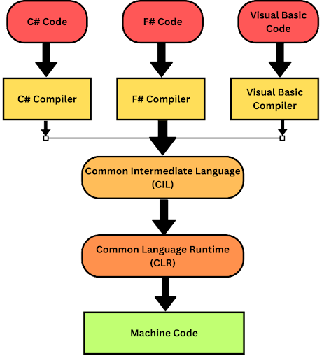 [1] In the first stage, the developers would be writing the source code using one of the many supported languages, which could be either C#, F#, or even Visual Basic. The C# Compiler, for example, the F# Compiler, and the Visual Basic Compiler are compilers that are uniquely specific to the individual programming language, taking high-level source code and converting it into a standard format, thereby opening the gates to the following process. This allows developers to use the language they like best while taking advantage of a unified framework for .NET.